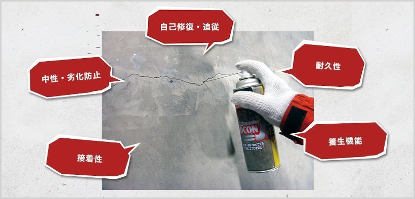 ラドコンジェットはラドコン7シリーズのクラック専用防水剤です。コンクリートのクラック内部に直接スプレーし、乾燥後に湿潤散水養生を繰り返し(乾燥→散水を3回以上)行なうことで、クラック内部に防水保護層を形成して漏水部に止水効果をもたらしてくれます。コンクリートのひび割れ内部の防水と、美観の回復をお考えの際には、ぜひラドコンジェットでの施工をご検討ください。素早く簡単に安心・安全の高品質な防水環境を手に入れることが可能です。